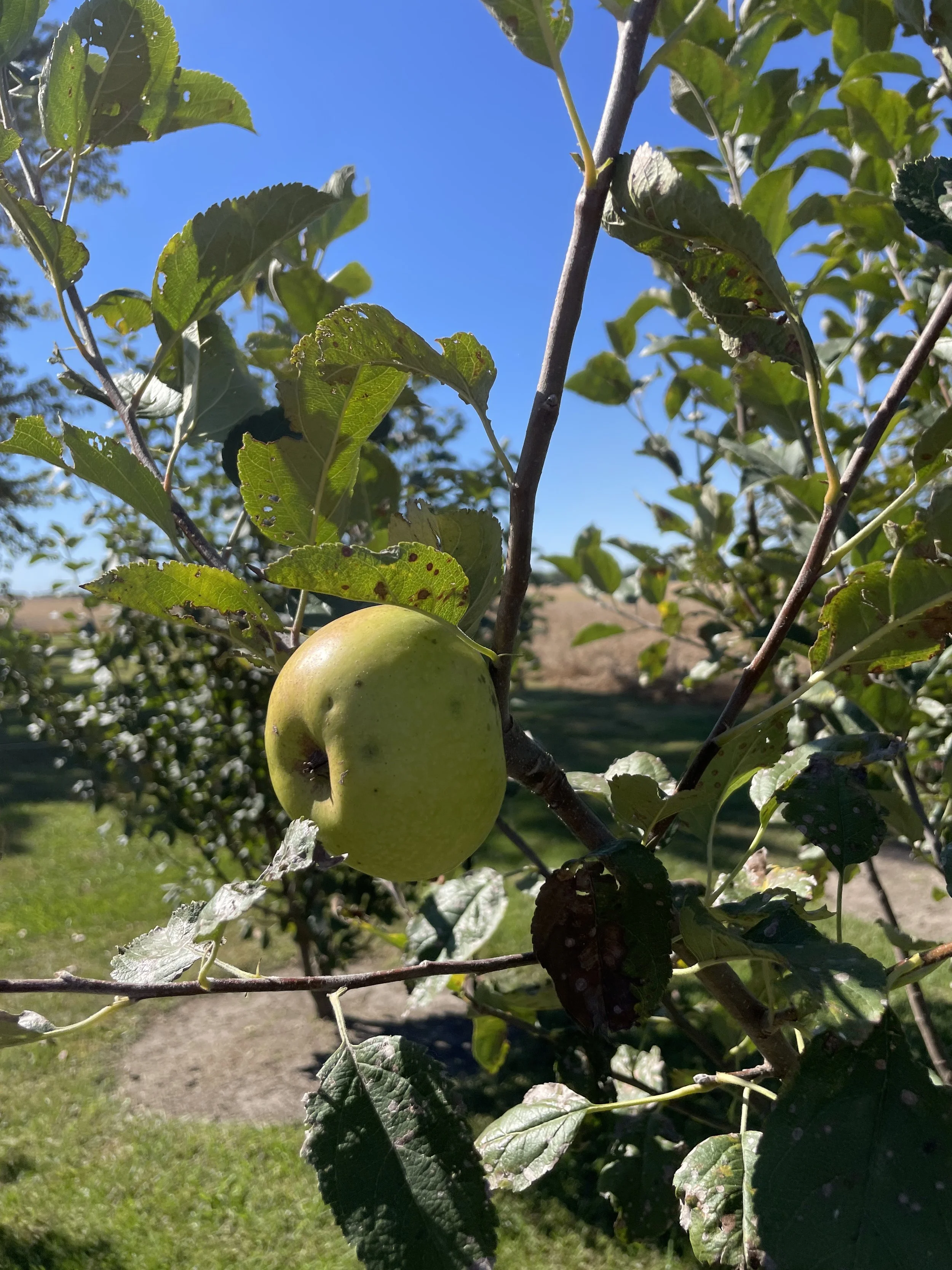Charles and I ate this apple first at Wolfe Orchard in Monticello, IL and were delighted with its’ firm yellow flesh and juicy sweet-tart flavour. On our apple exploratory trip of 2020 we visited Albemarle Ciderworks in VA and tested more of these wonderful apples, regionally known as Albemarle Pippin. In our orchard the tree has had some frustrating issues for me to figure out. I am thankful for David from Century Farm Orchards in North Carolina who is wonderful at rare tree diagnosis, and has been an invaluable help. We look forward to our first delicious Newtown Pippins this fall.